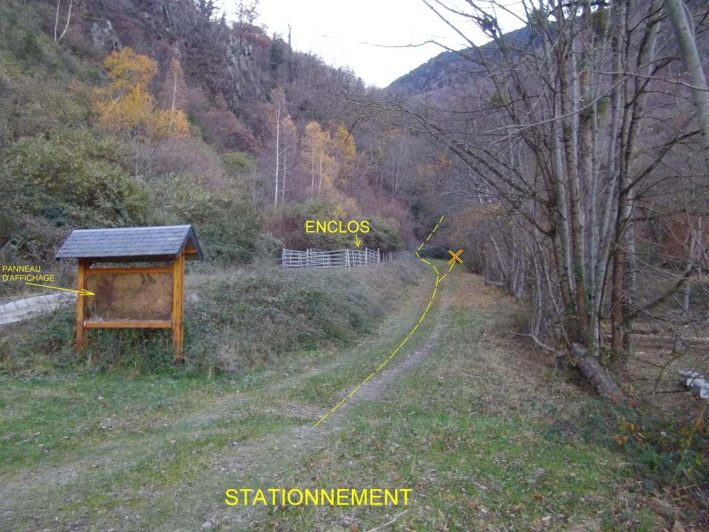 Se placer face à la porte d’entrée de la cabane d‘ARTIGUE, et remonter la pente en longeant la cabane sur sa droite. Continuer à monter de 60 mètres dans le pré pour voir le chemin qui monte vers la droite dans la forêt.