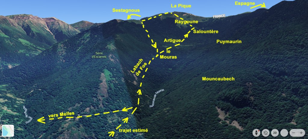 Sestagnous et la Coume de Raygoune. Nous marchons aisément. Le curé de Melles tue un écureuil au sommet de la forêt. Dans le bois assez clairsemé, couvert encore de son manteau d’hiver, nous pouvons descendre sur la mousse entrecoupée de rhododendrons et de tiges de myrtilles. Après une pause à la fontaine, nous descendons vers Melles. Les bûcherons abattent une coupe, font descendre les roules. La forêt en partie à l’ombre est encore fraîche mais il