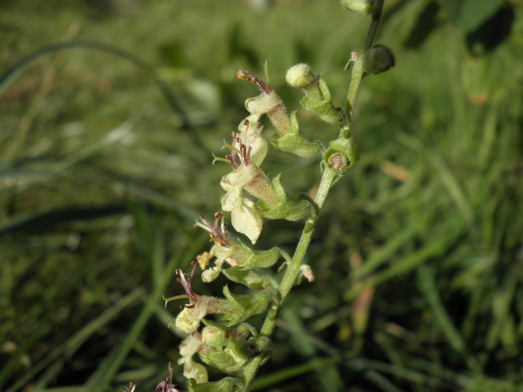 Le long de la route, je m’amuse à cueillir la germandrée à fleurs jaunes pâles, germandrée scorodonia ou sauge des bois qui foisonne, recommandée comme tonique, diaphorétique et fébrifuge.