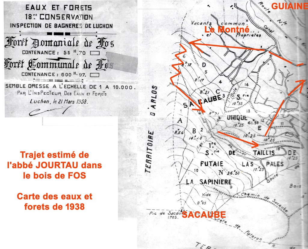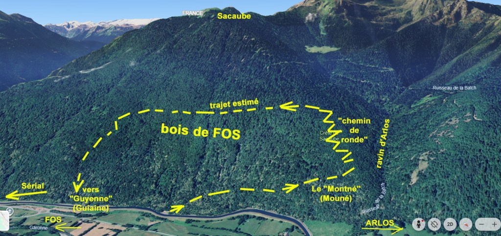 C’est là que je rejoins le chemin de ronde forestier qui serpente entre Arlos et Fos, le long de la crête qui sépare la ravine de Fos (Il doit plutôt s’agir de la ravine d’Arlos) du bois de Fos, qui forme un grand triangle dont la pointe est au dessus de Sacaube et les autres angles vers la tour du Sérial et le Montné.