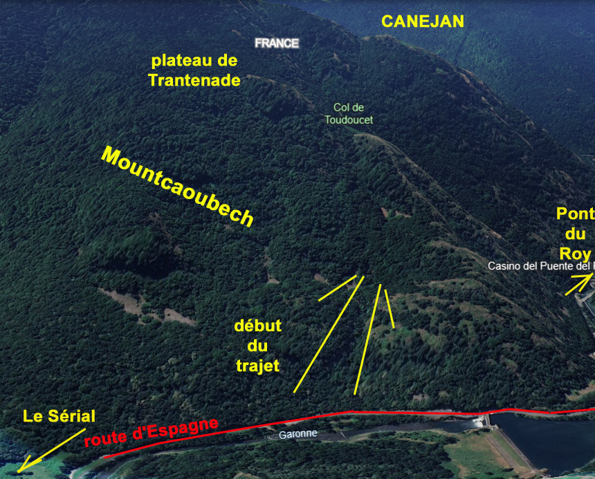 Je me trouvai alors en pays bien connu. Je pris donc la route qui monte vers la forêt de sapins de Mountcaouvech, indécis si je me dirigerai vers Canéjean ou vers la fontaine de Poumaourin. Je me décidai pour ce dernier parti et arrivé sur la traversée de Canéjean, je remontai dans la forêt de Fos pour trouver le chemin traversier d’exploitation de la forêt. Je pris le premier que je rencontrai sur ma gauche, mais à une certaine profondeur, avant d’arriver à la grande ravine qui descend du monticule le plus élevé, ce sentier disparaît.