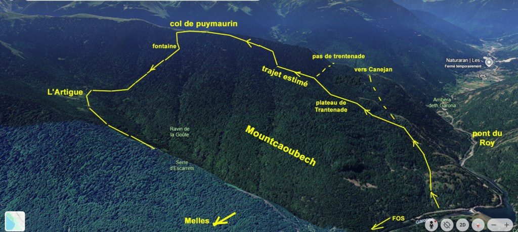 Arrivé à la crête de séparation avec Melles, je descendis jusqu’à la cabane en ruine qui se trouve sur la crête et je gagnai le village de Melles. Il était six heures quand je regagnai mes pénates.